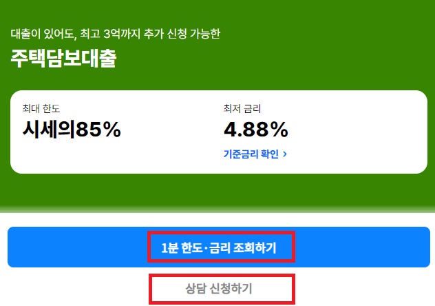 신청하기 위해 가장 간편한 방법은 현대캐피탈 주택담보대출 상품페이지로 방문하여 1분한도 및 금리조회하기 또는 상담 신청하기 버튼을 누르시면 됩니다.